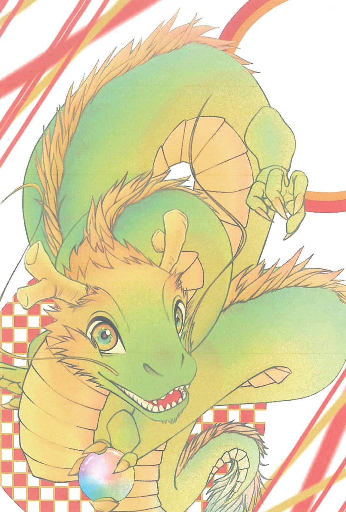 Kahoが描くオリジナルイラスト。 辰年の年賀状として色鮮やかな龍を画面いっぱいに描いています。 印刷サイズはポストカード(幅100㎜×高さ148㎜)を推奨。